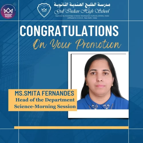 πŸ‘ Ms. Smita Fernandes has been promoted to Head of the Department – Science (Morning Session).
